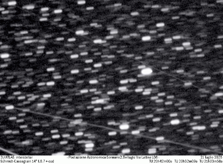 From the Sormano2 Astronomical Station at Bellagio L06,location Scegola. With a 14" f/6.7 Schmidt-Cassegrain + CCD: photo of the interstellar comet 3I/ATLAS. Photo information. Three astrometric measurements sent to the MPC.