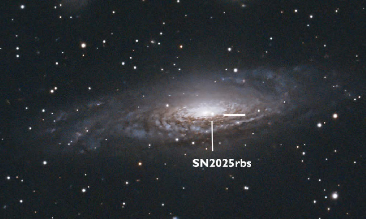 Taken the morning of 2nd August 2025 with SN2025rbs probably near max brightness. 30 x 300 sec subs with asi2600 mc pro camera. Flt132 telescope.