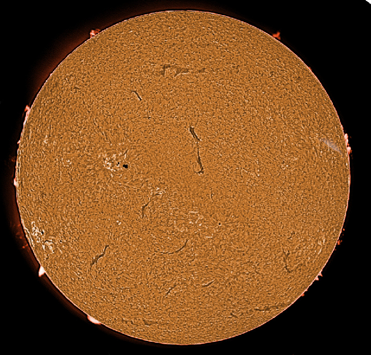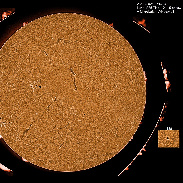 Quite a lot of activity on the E and SE limb this morning. Complex active regions 4195-4197 and a new spot appearing on the limb near the solar equator. (4199)