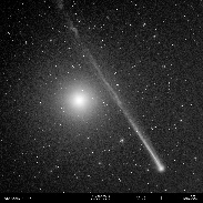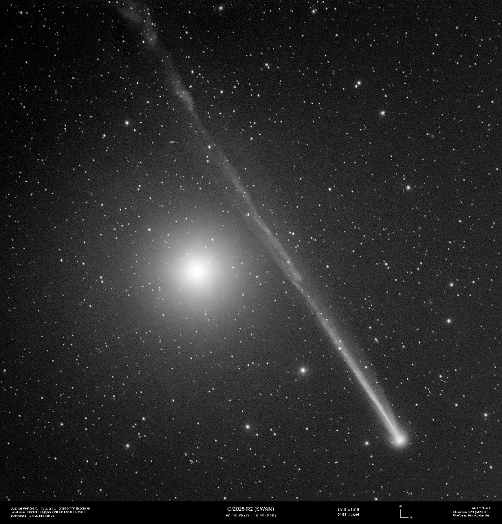 A wide-field view of C/2025 R2 (SWAN) close to the bright double-star Alpha Virginis (Spica) and showing various lumps and bumps in the long ion tail.