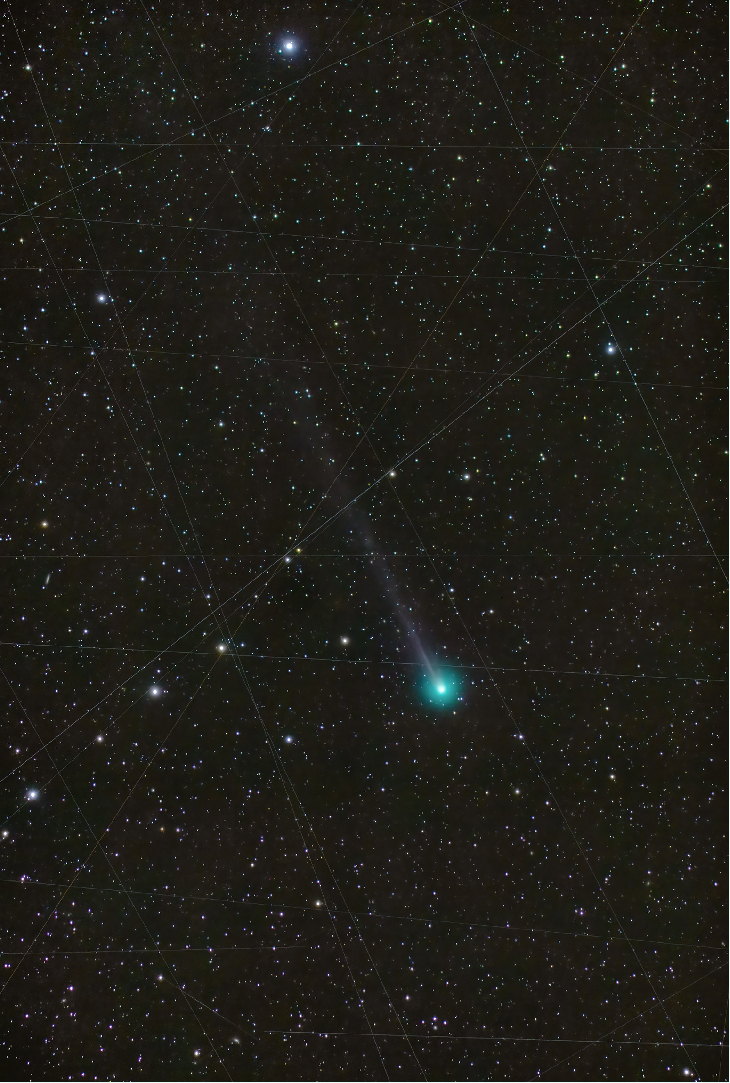 Comet A6 Lemmon is a very active wonderful comet, whitch, as you can see in the image, is overlaid by many satellite lines within 20 minutes. The image is a stack of 12 images, each exposed for 2 minutes, through a Takahashi FSQ 106 telescope, at aperture F/3.6, an a field of view, FOV. 3°x2°. A Canon EOS RP(crop) served as camera, at ISO 1600, in the period from 02:28h-02:56h UT....shortly bevore a marvellous moonrise.