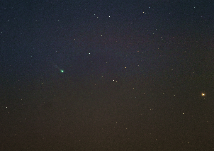My 3rd attempt at Comet C/2025 R2 (SWAN) from Tarpon Springs Florida over the Gulf - finally, a tail is visible from North America! About half a degree of green tail was captured, about the width of the Full Moon. The comet had just dropped below a low cloud bank when I started getting clear images, so the stacked image has a lot of noise and haze but the comet was in a relatively clear patch for the duration of this image. The frame is about 3 degrees wide, Mars is to the right. Canon R8, Sigma 150-600mm f5-6.3 C, 600mm, f6.3, 33x10s = 5.5 minutes total exposure, ISO 1000, 8:28-8:34 PM EDT 9/22/2025. Stacked and processed with DeepSkyStacker 5.1.3 and DxO Photolab 8.8 using 10 darks, 10 bias, 10 flats, and 10 dark-flats