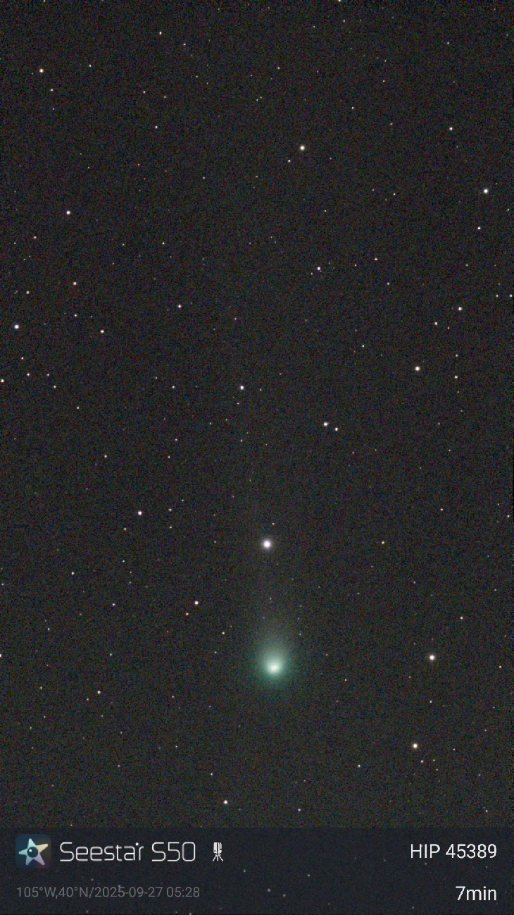 SeeStar S50 image at 11:25 UT Sept 27. Stack of 10s exps. Also in 25x100 binos I could see it easily as a round, fairly dense fuzzball with the slightest hint of a tail.