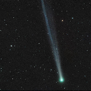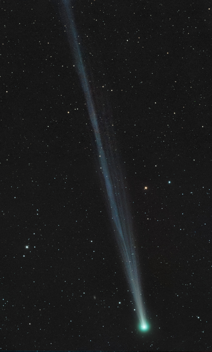 While the northern hemisphere is eagerly watching comet C/2025 A6 (Lemmon), the other, recently discovered visitor, C/2025 R2 (SWAN) is still a beauty weeks after its perihelion. I used a remote telescope in Namibia via Skygems Network to capture it on 26th sept. before moonlight got too strong, stitching two panels to fit the first 2 deg. of the tail into the image (18" Telescopi Italiani TI450 scope, 2x120s. Lum, 1x120s. R, G and B each for both panels). Even though nearby Moon shining into the telescope made image processing difficult, a nicely structured gas tail was revealed with shorter, faint threads and a bright main band. Galaxy IC 991 can also be seen at the bottom of the image, to the left of the comet.