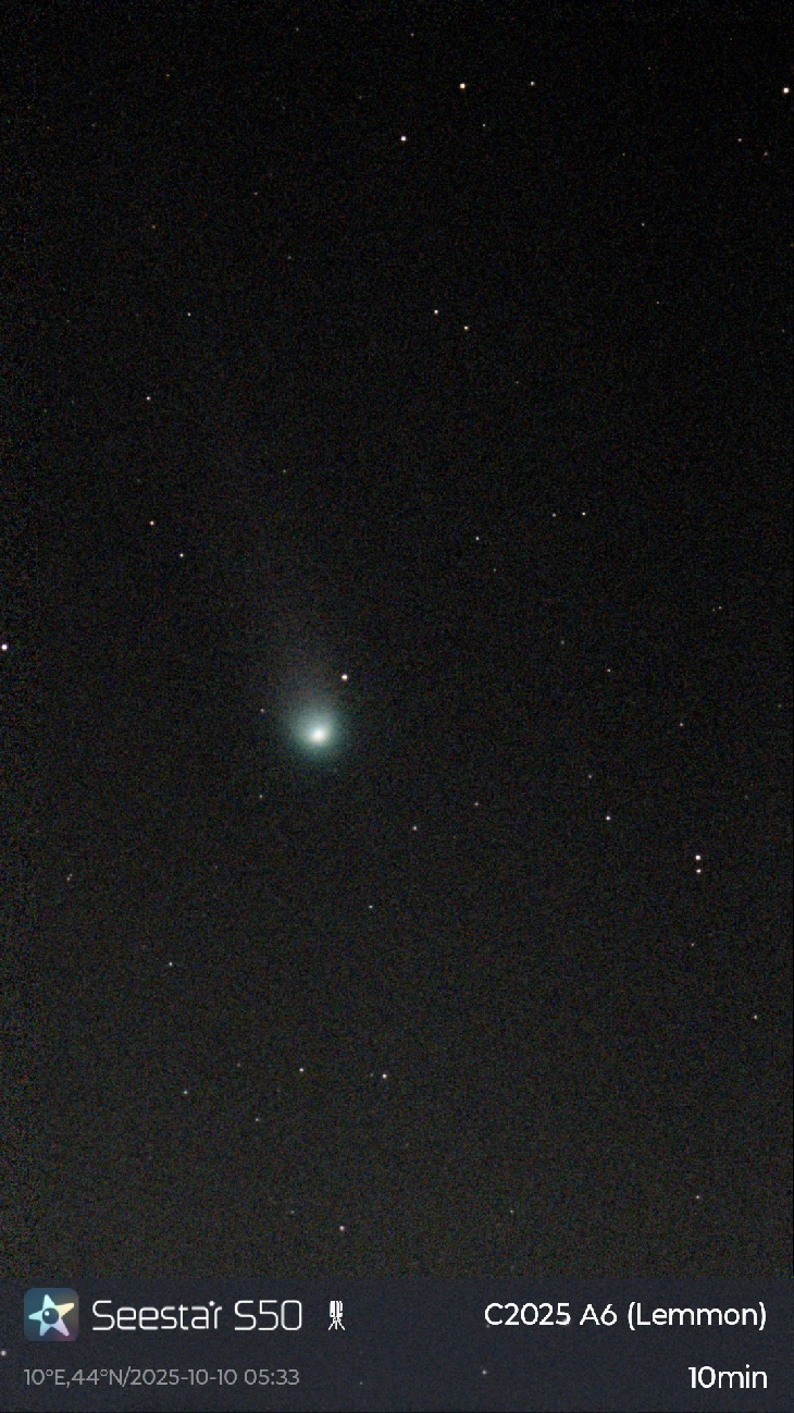 Comet C2025 A6 Lemmon. 10-minute exposure with SeeStar S50 from Sassuolo - Modena - Italy - Bortle 7.5 sky and nearly full moon.