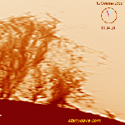 Cloud free Autumn day in the Scottish Highlands let me catch this huge frisky prominence on the Sun's eastern limb. It looks to be about 110,000km high. Also, I reckon the plasma blobs moving horizontally left to right are going at 135,000km/hr!