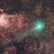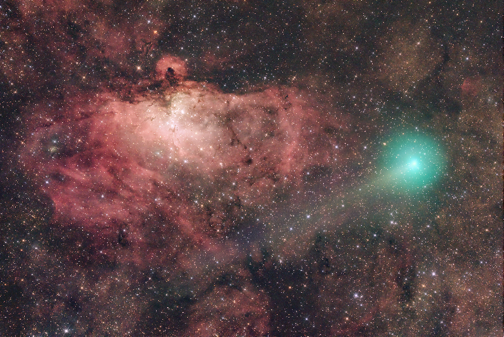 From the Southern Hemisphere, comet Lemmon is (still) out of sight, but another, almost forgotten comet is currently crossing the Milky Way. C/2025 R2 (SWAN) is even visible to the naked eye under the pristine skies of the Atacama Desert, and I captured it while it was (apparently) passing through one of the most iconic and spectacular regions of the sky: the Eagle Nebula. This image was taken with a 130 mm Newtonian reflector, averaving 40 exposures of 120 seconds each, aligned both on the comet and the stars. It was also an amazing sight through the eyepiece, with its characteristic green coma drifting across one of the most observed nebulae in the sky.
