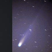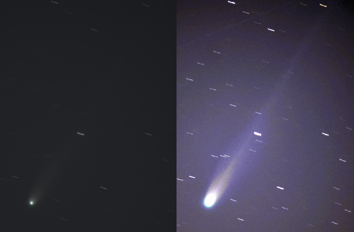 Two versions of same image. Original (left) and "enhanced" (right) to show more of tail. Average of ~90 images, each at 8 seconds and ISO-1250. 300mm/f4 on DSLR. Brightest star is mag. ~6, so comet is clearly much brighter. From BNL on Long Island, about 58 mi east of NYC.