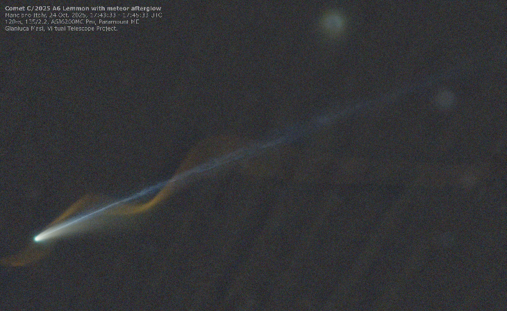 On 24 October. 2025, while imaging comet C/2025 A6 Lemmon from Manciano, Italy, I captured a meteor crossing the same field of view. Soon after, its red afterglow showed in the same field of view, adding its intriguing, fast evolving shape to the scene.