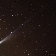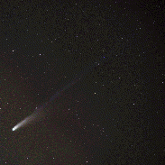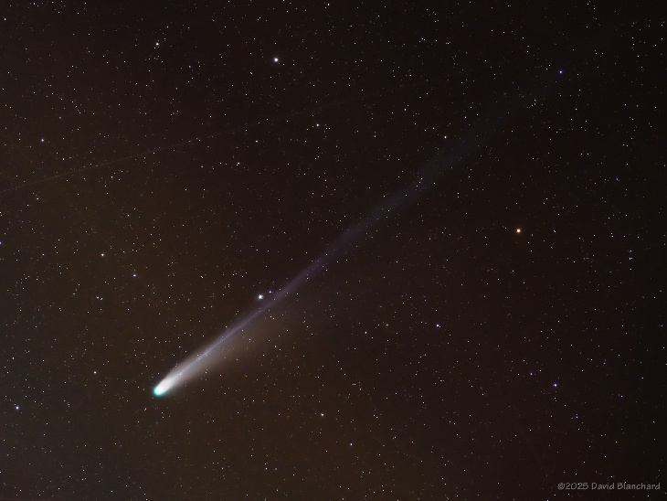 Motion of the comet over a one-hour period. The sky was flooded with satellite streaks that overwhelmed the time-lapse of the comet. I have found that Photoshop > Remove > Find Distractions > Wires and Cables does an okay job of removing satellite and aircraft tracks -- although it will also remove some stars.