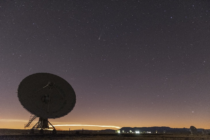 I went to the Very Large Array in New Mexico to shoot Comet Lemmon with the Radio Dish array in the background. While I was there, I witnessed a launch from about 700 miles to the west of a Falcon9. While the launch was dimly visible in the twilight, as the sune set it illuminated the launch plume beautifully. Of course at that time of night it also illuminated many Starlink satellites already in orbit, with Comet Lemmon completing the scene.
