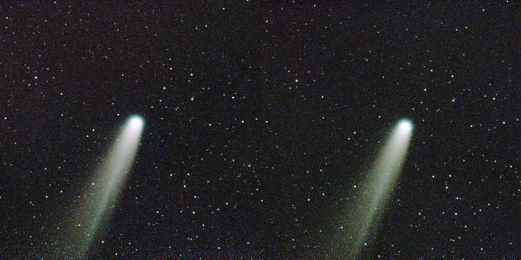 Two images of Comet C/2025 A6 (Lemmon) taken by Barbara Watson about 20 minutes apart showing movement relative to background stars. Use the "cross-eyed" method to see in 3-D. Dwarflab3, 20 x 15 sec, Gain 120.