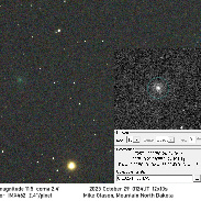 Comet C/2025 T1 (ATLAS) brightened very quickly from the time it was discovered several weeks ago at magnitude 17 and is now around magnitude 10, but it does seem to have stopped brightening at magnitude 10. Speculation is now about what made it brighten so quickly, a major eruption of course and what might have been the cause. In this image the comet was magnitude 10.4 with a 4' wide coma under a very bright Moonlit sky, a similar image taken 5 days ago had the comet at magnitude 11.5 with a 2.4' wide coma. Unless there are more big eruptions on the comets surface, the comet is expected to remain at about magnitude 10 as it passes Earth on Nov 14 and reaches perihelion on Dec 2. Click on the large image to bet a better resolution image.