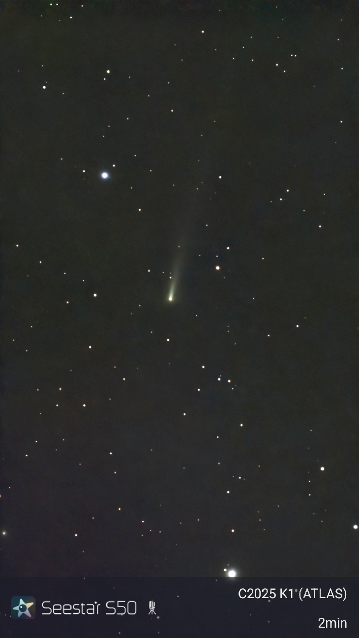 I used SeeStar S50 10s exposures for 2 minutes. SeeStar AI denoise and some contrast boost. I was surprised at how well it turned out and how long the tail was. Nov. 9 12:00 UT