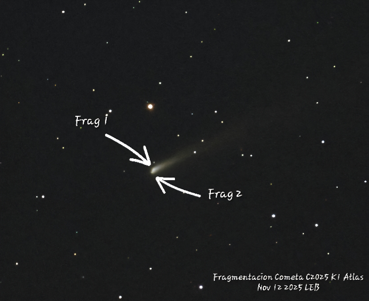 Analyzing pictures obtain from Nov 12 I noticed Comet 2025 K1 Atlas fragmented in at least two main pieces. The fragmentation was not present in prior observations on Nov 7,8,9 0r 10