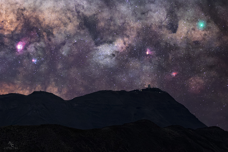 During the recent photography expedition I took in Chile with the amazing team at @luzlux, I had the unique opportunity to capture a truly spectacular alignment over one of the most iconic places in the world for astronomical observation. The photograph was taken from 11.2 kilometers away, from another observatory, the private El Pangue Observatory, where, interestingly, this perfect coincidence occurred. That night, a chain of coincidences aligned almost magically: the SWAN comet was right in the heart of our galaxy from our perspective, and I was at the exact spot where the triple alignment Milky Way – SWAN comet – Cerro Tololo reached its peak perfection as the night went on. An unrepeatable moment, difficult to process in days so full of emotions, experiences, and discoveries.