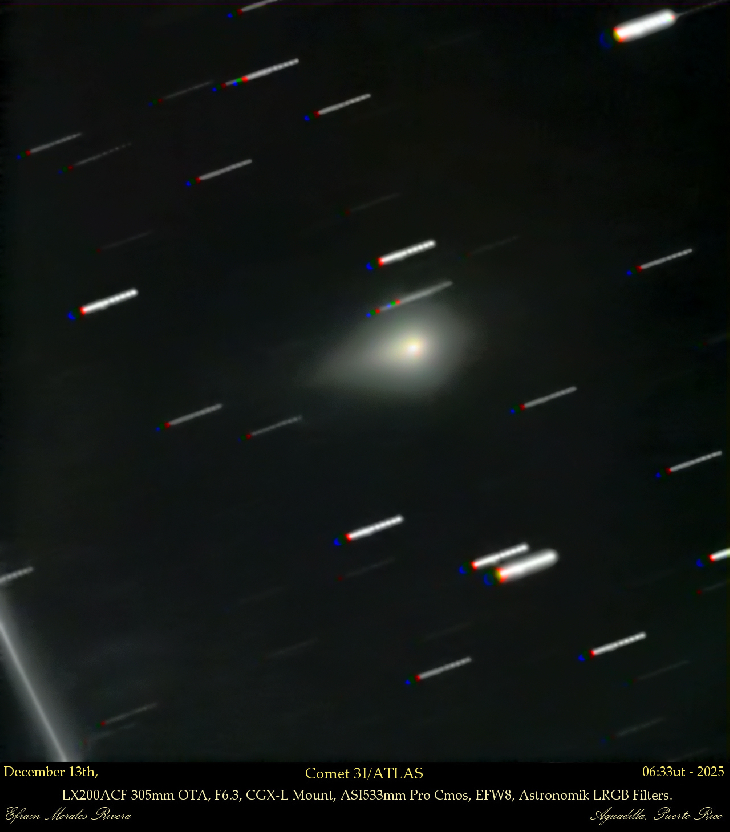 Comet interstellar 3I/ATLAS showing a gold tone nucleus and six days to closest approach to Earth. taken on December 13th.
