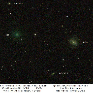 On the morning of December 26 Comet 24P/Schaumasse passed 1/2 degree from the background Spiral Galaxy Messier 100 as observed from Earth. The comet and galaxy were about the same brightness, but the comet was only 0.00000946 light years away while the galaxy that has some 400 billion stars was 56 million light years from Earth. The image is a stack of 30x10s images with no special processing done to any of the images or the final image, this is what the camera observed through a 50mm f/5 refractor for 5 minutes. The upper right inset is a smaller negative image which better shows the large coma of the comet. The lower right inset was used to calculate the magnitude of the comet. The second image labels the brighter galaxies.