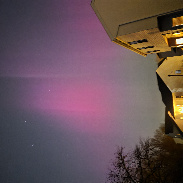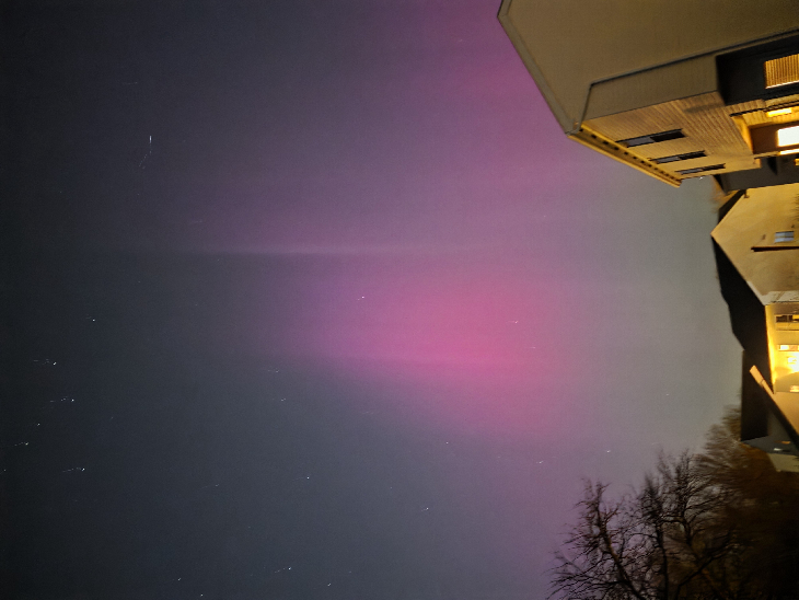 Briefly visible to the naked eye early Tuesday evening, but pink pillars and green band were clearly visible on camera phone.