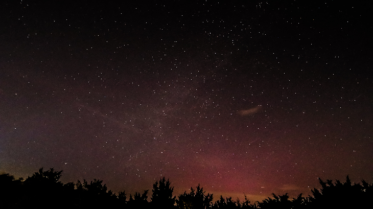 I shot a few pics just to set exposure for a NNW-facing 8-hour time-lapse video. At 8:00pm CDT, the red was surprisingly visible, although faint. The video is much more interesting, especially with cloud activity.