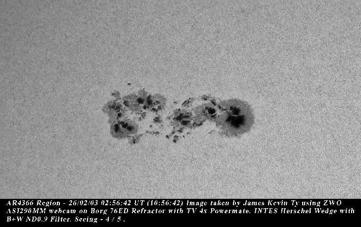 AR4366 Region started as an inconspicuous pore group and jn a matter of few days has grown hugely in size! Awesome to view both in whitelight and Ha wavelength. Images taken using ZWO ASI290MM Webcam on Borg 76ED Refractor on AM5 mount. Whitelight images using INTES Herschel Wedge while Ha image taken using Daystar Qusrk Chromosphere Ha Filter.
