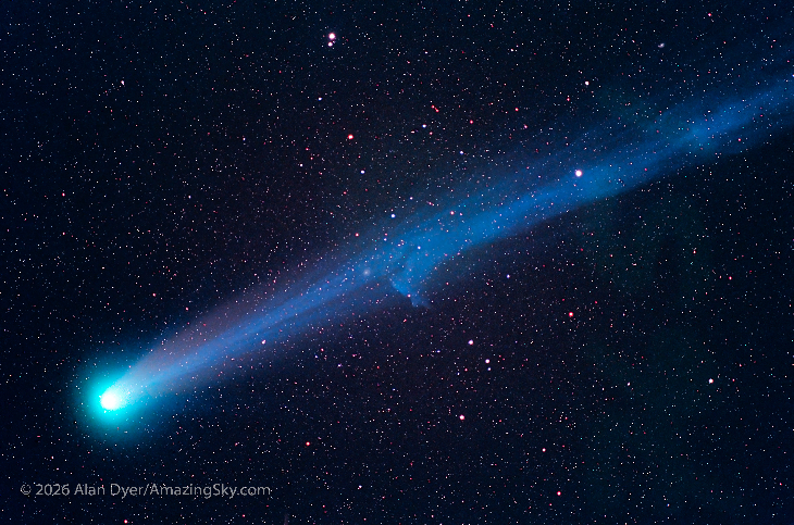 This is the Great Comet Hyakutake (Comet C/1996 B2) — Taken on March 25, 1996, on the night of the comet's closest approach to Earth with the tail at its greatest length and with a disconnection event in the tail, and (!) with the galaxy Messier 101 in the tail.