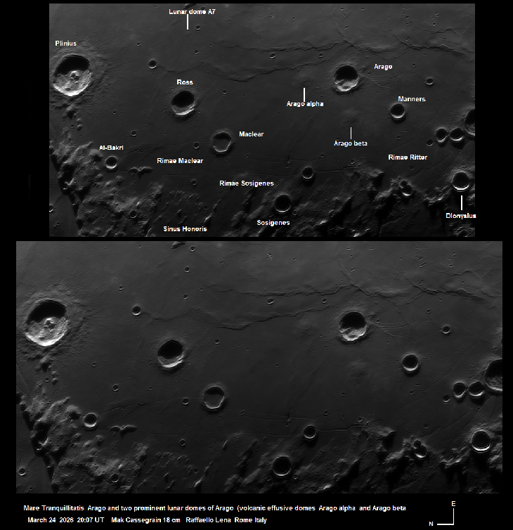 Two volcanic edifices, Arago domes are shown in the image taken on March 24 2026, using a Mak Cassegrain 18 cm.Lunar domes formed during the terminal phases of lunar eruptions and mostly occur in the maria. Few domes have been reported in the highlands. These volcanic constructs formed during the later stages of volcanic episode on the Moon, characterized by a decreasing rate of lava extrusion and a comparably low eruption temperature, resulting in the formation of effusive domes. The region imaged is located in Mare Tranquillitatis.