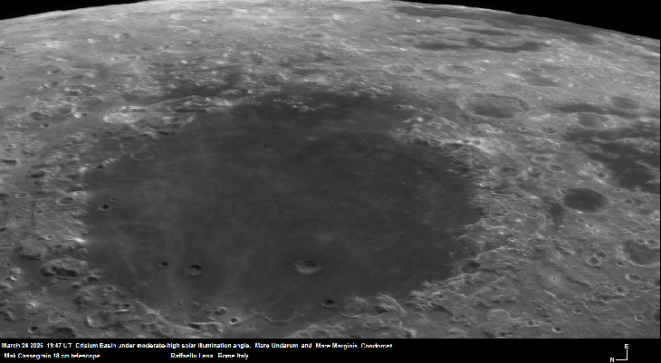 Under moderate-high solar illumination angle i have imaged the Crisium basin and nearby features. The mare appears to be elliptical in a north-south direction, but this is due to foreshortening.The basin is relatively flat, and darker than the surrounding areas. Image made using a Mak Cassegrain 18 cm.