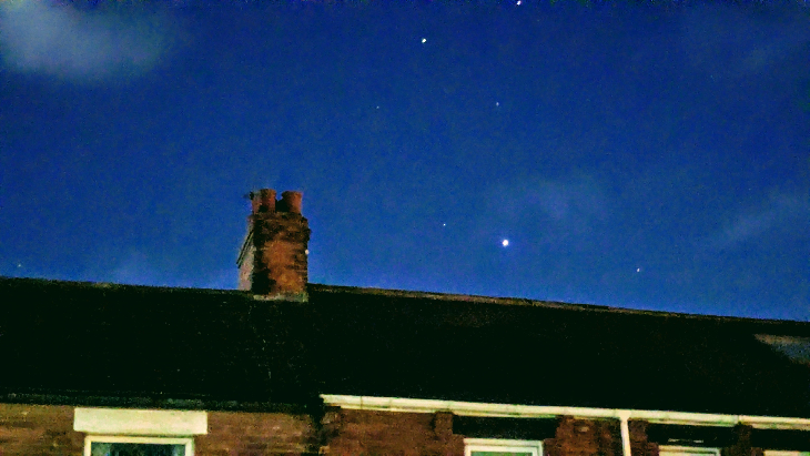 Jupiter and the Twins going down in the west after the sky abruptly cleared after Storm Dave.Google Pixel 6a.