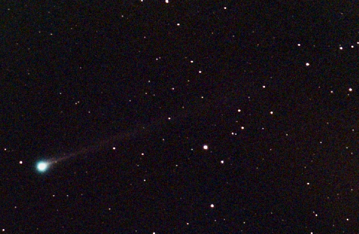 April 7. Got my first sight of this comet this morning beginning around 04.45 BST. Easy to spot with the telescope Dwarflab Mini. Blue Green nucleus and long thin tail. Not the best viewing conditions from central London with some high altitude cloud. Managed about 22 30 second exposures. This is a cropped image and somewhat noisy.