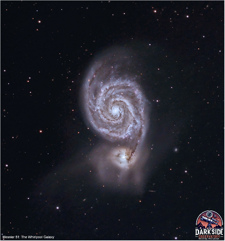 Messier 51 (also known as M51 or NGC 5194) is one of the most famous and visually stunning galaxies in the night sky, widely celebrated for its "grand-design" spiral structure. Located approximately 23 to 31 million light-years away in the constellation Canes Venatici, it was the very first galaxy to be identified as a spiral. M51 is famously locked in a gravitational "cosmic dance" with its smaller companion, the dwarf galaxy NGC 5195, which appears to be tugging at the end of one of its massive spiral arms. This interaction has sent tidal shockwaves through M51, triggering intense bursts of star formation that illuminate its arms with brilliant pink nebulae and clusters of hot, blue young stars. Because it is oriented face-on to Earth, it provides astronomers and astrophotographers with a perfect, unobstructed view of its sweeping dust lanes and active galactic nucleus, which is powered by a central supermassive black hole.