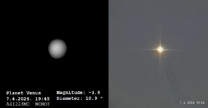 Tonight Venus was visible from my backyard, so I took the opportunity to try out the new ASI224 camera for a "close encounter" with Venus. In the image on the right, Venus was captured with a Xiaomi Redmi14 using a Bahtinov mask to get 4 nice rays