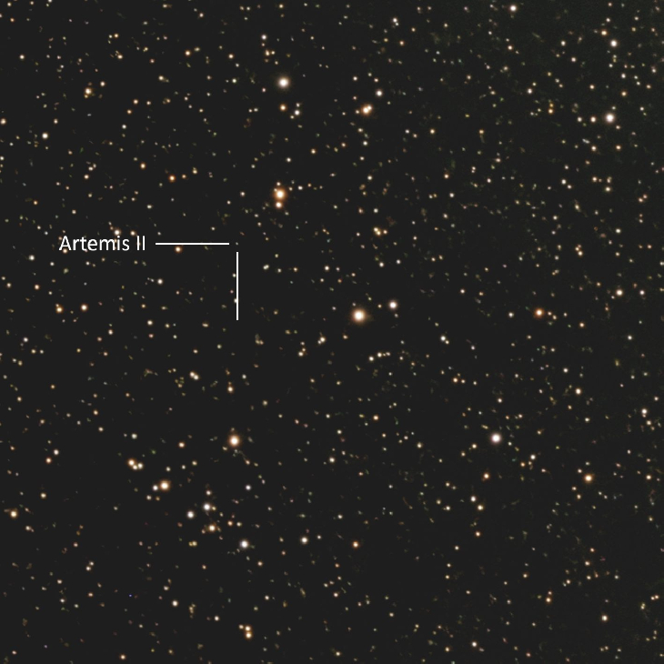 Using JPL-NASA ephemeris data and scripts written by Shawn Gano, I located the Orion-Artemis II spacecraft within Stellarium and could then image it, similar to how I would image a fast-moving asteroid or comet. It was moving among the stars, 333,800 Km (207,400 miles) from earth at the time of the photos.