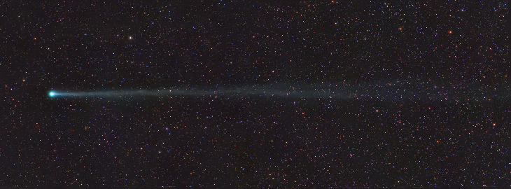 This morning's shooting session on Comet Panstarrs R3 in Pegasus went pretty well, lots of dust and pollen suspended in the air made for a yellowing and diming of low altitude targets such as this. Here is a two part mosaic with the RASA8, 20 minutes per panel. the field is 6 degrees wide and so this comet has developed a really nice tail! I might add that I rotated the camera about 15 degrees so the tail was along the frame edges making assembling the mosaic far easier.