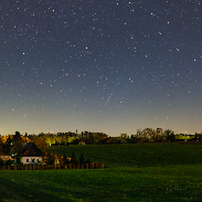 In the morning sky, just before the twilight, the comet C/2025 R3 (PanSTARRS) can be easily found. It is located in the constellation Pegasus, just by the asterism of "Pegasus Square". Northerners can succeed with its spotting through a small telescope, where even a long tail develops. I was lucky to see and capture it this morning as I had a perfect view of the comet over Proseč u Chrudimi, Czech Republic, just before twilight. The comet’s tail exceeded 14 degrees in the photographs, making it such a nice object along with the Andromeda Galaxy located on the left. The moonlight made the foreground decently illuminated at the same moment when an “early-bird” driver went in the car down on the road.