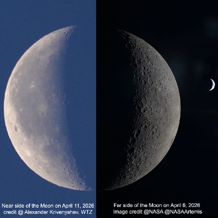 Following Artemis's successful splashdown less than 12 hours ago - back to earthly reality - a beautiful Waning Crescent Moon this morning April 11, 2026 vs photo of the Artemis ii Far Side of the Moon on April 6, 2026 - credit @NASA