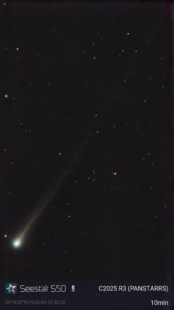 Comet C2025 R3 Panstarrs. Imaged in the dawn sky on 13 April 2026 at 03:30 UT Imaged with SeestarS50, 10min of 10sec images