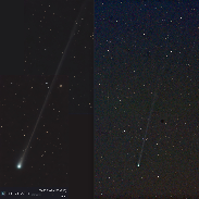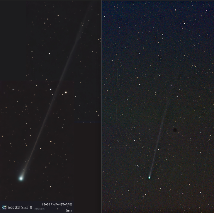 The left side of this image is a SeeStar S50 mosaic of 2 panels showing 2° of tail. The right side is using my nikon D750 with 200 mm zoom. A stack of 20 sec exposures flattened in CCDstack2. It shows 4 deg of tail. Apr 12.5 UT.