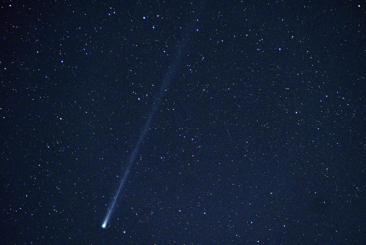 The comet appeared as magnitude 4.2 with +5 degree tail in this uncropped 5x7.5 degree image. Twilight was breaking just before 5AM.