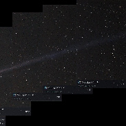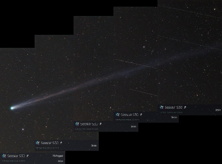 Much more detail was visible in the head of C2025 R3 Panstarrs this morning. Skies were rather clear, comet's tail was easily visible in binoculars. Shot with Seestar S30 for 3-minutes per segment from 5:15 to 5:31. Although I was able to trace the tail out through 9 shots and 6 2/3 degrees, I chopped off the later shots which were very light in tail structure, cutting it down to about 4 1/2 degrees here.