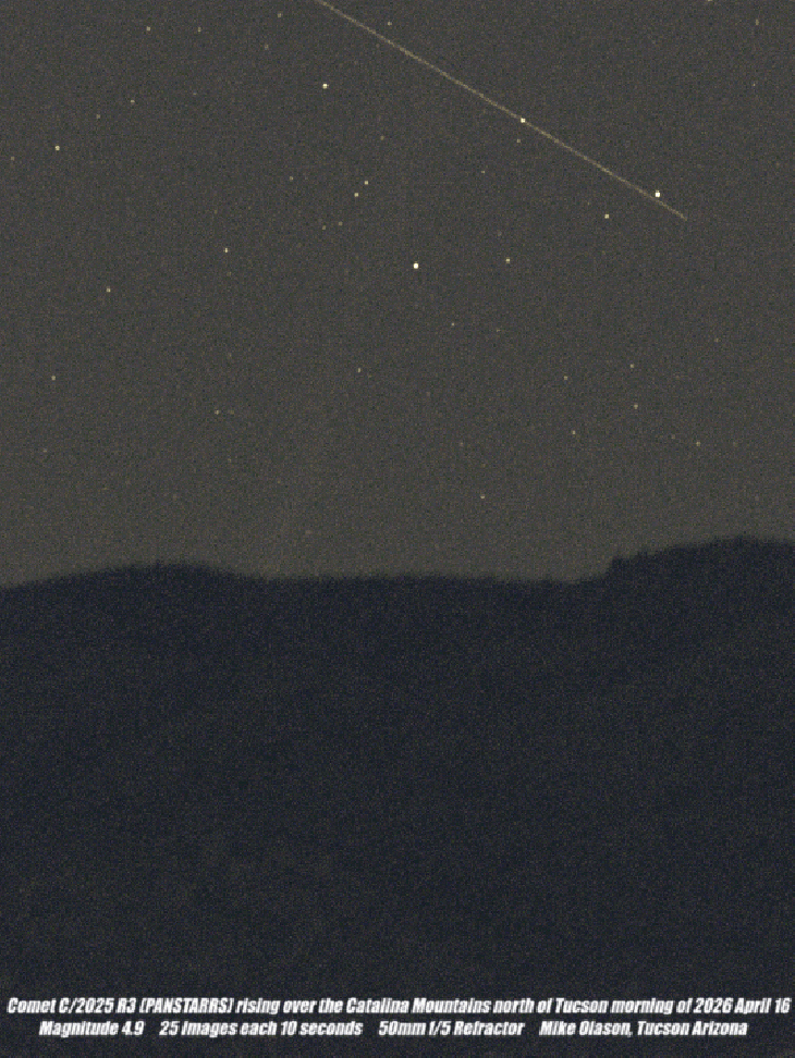 Gif animation composed of 25 images each 10 seconds long of Comet C/2025 R3 (PANSTARRS) rising over the Catalina Mountains north of Tucson on the morning of April 16 at an altitude of 4 degrees. The comet was magnitude 4.9 and a mosaic created later showed 10 degrees of the tail which was longer than 10 degrees. The atmospheric interference at this low altitude and the short 10 second images taken with a small 50mm f/5 Refractor did not show the tail very well in this gif animation. Click on the gif to get a good resolution gif animation.