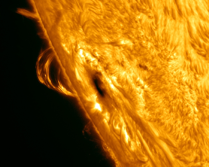 Well with some cloudy weather moving into our area on Tuesday, I decided I had better get out today. With major sunspot groups strategically placed for a great capture we headed for the park. As luck would have it a small but short lived loop prominence occurred near AR 1875 and we were there to capture it!