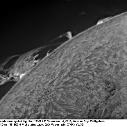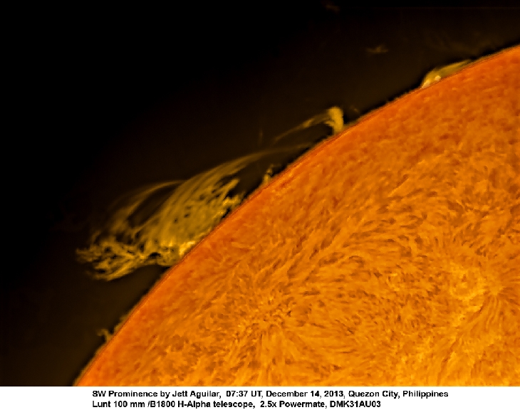 This afternoon,around 07:37 UT,I was able to image a huge beautiful SW prominence using my Lunt 100 mm hydrogen alpha telescope and a DMK31AUO3 monochrome camera. Seeing was poor and the sky was hazy.