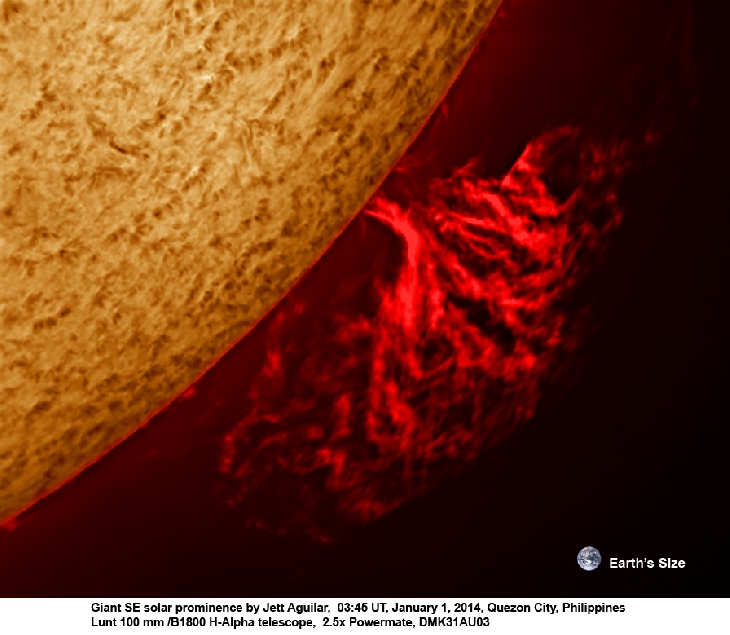 The sun was really full of activity yesterday and I was lucky to image one of the largest and most beautiful solar prominences I have ever seen. The sun seemed to be celebrating the new year with its own fireworks show!