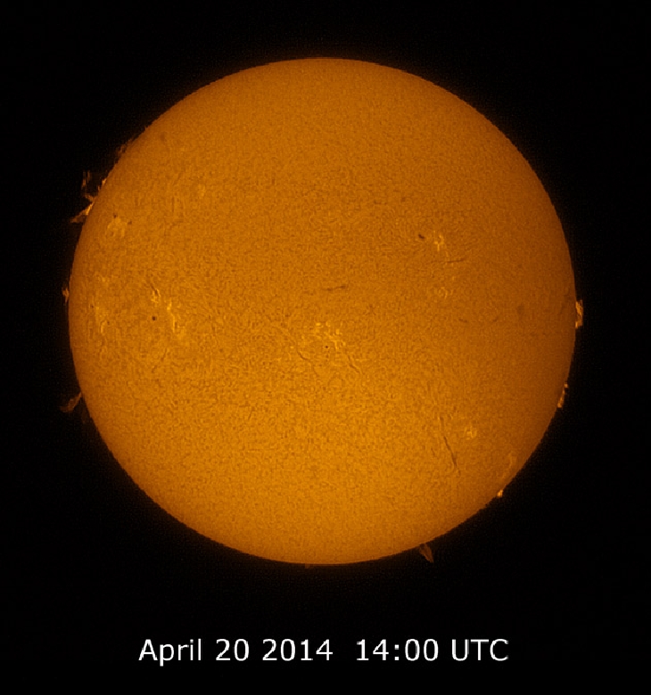 The surface and prominence shots are 5 layer stacks. Treated with Lynkeos' Lucy-Richardson algorithm and Photoshop for stacking, montage and colour.