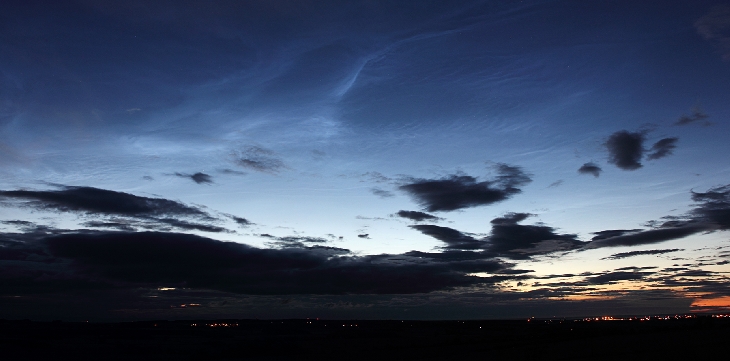 Although not a very bright NLC display, plenty of intricate structure could be seen through large gaps in the tropospheric cloud cover.
