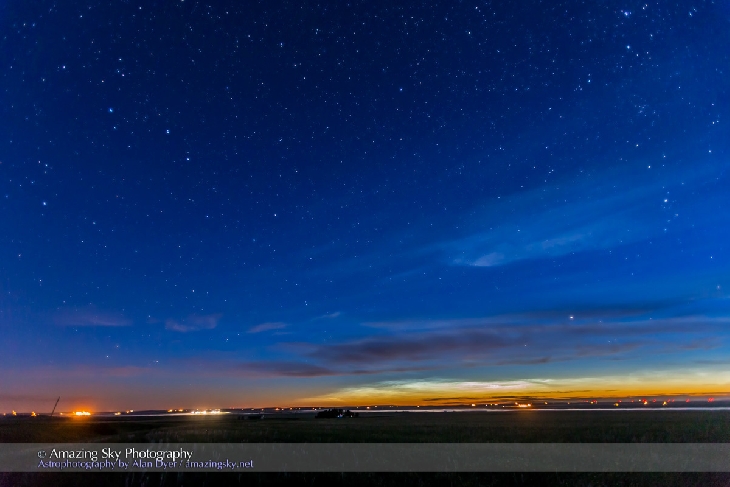 There were some bright but low altitude NLCs visible through the night, June 22-23, from southern Alberta, getting brightest before the dawn in the northeast as they began to catch the Sun again. This is a shot from about 2 am MDT on June 23 with a wide 16mm lens to also frame the Big and Little Dippers.