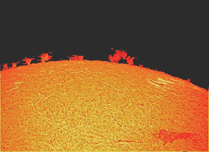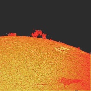 Employed a Meade 102ED (4 inch objective refractor), with a Coronado Solar Max 60 Hydrogen Alpha Filter plus a PST MOD (Personal Solar Telescope) Etalon removed from the PST and inserted up into the optical path of the larger refractor - creating a double filter. Imaged with a new Skyris 247 camera in monochrome, and colored in Photo Shop.
