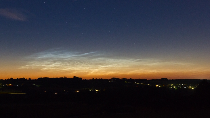 A nice display of noctilucent clouds on July 3, 2014, over Austria (48° N). This image was taken at 22:59 CEST, 113 minutes after sunset. At an altitude of ~80 kilometers, noctilucent clouds are the highest clouds in Earth's atmosphere. Therefore, they are still illuminated by sunlight even when the ground and the lower atmosphere is already dark.
