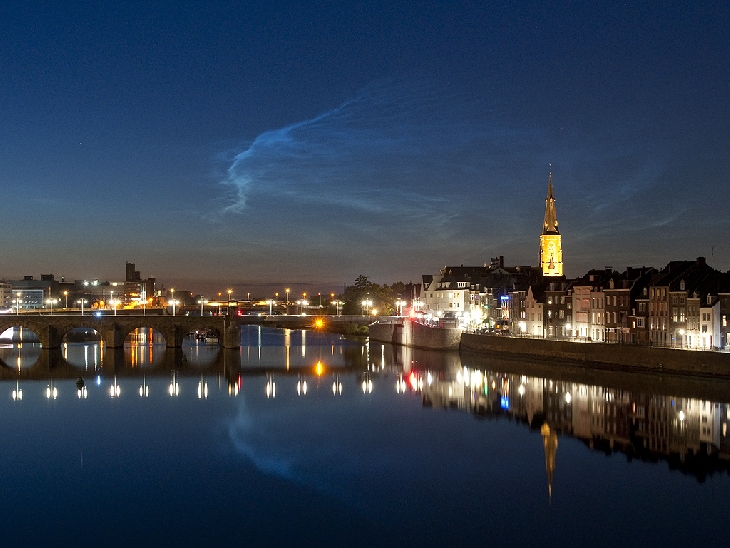 First time to see such a fine display of noctilucent clouds in my hometown Maastricht, the Netherlands. My camera revealed details I couldn't see with my nakes eyes, beautiful! Bonus, the reflection in the water of the river Maas.